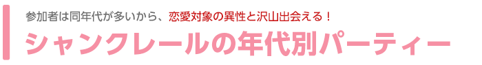 ある程度、年代を区切った婚活パーティーは共通の話題も多いので、特に婚活初心者にはお勧めです。シャンクレールは年代別パーティーが豊富。「どんな人が来るのかな」と不安な初心者もまずは「同年代」に絞れば、共通の話題も見つけやすく、リラックスしやすいですね。